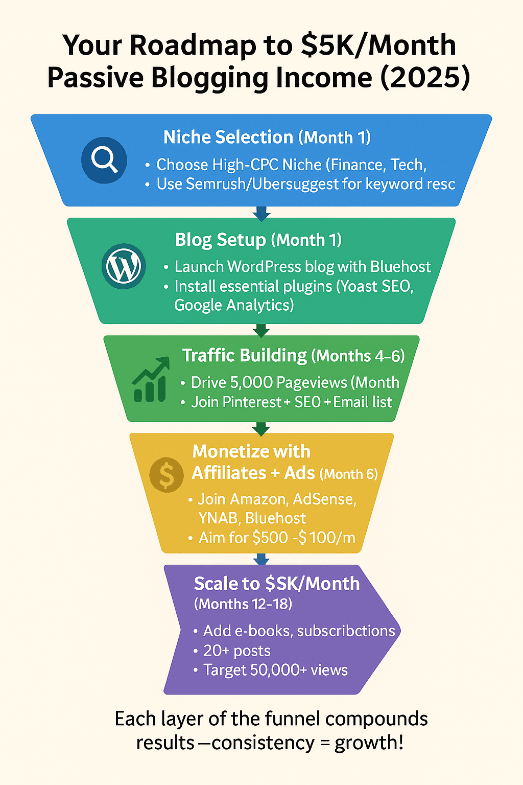 Here’s a clear roadmap to guide you from zero to $5,000/month in passive income by 2025. Picture a funnel with arrows flowing from “Niche Selection” at the top to “$5K/Month” at the bottom, each step color-coded for clarity: